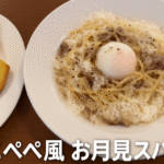 カプリチョーザの秋限定メニュー「カチョエペペ風お月見スパゲティ」をいただきました。カチョエペペはチーズと黒胡椒だけで仕上げるローマの伝統パスタですが、こちらは日本的に“お月見”を意識して温泉卵をのせた一品。たっぷりのグラナパダーノチーズが雪のようにかかり、見た目からして豪華です。具材にはマッシュルームや肉も入っていて、シンプルながらボリューム感があるのも特徴。まずは卵を崩さずチーズと胡椒の力強い風味を楽しみ、途中で卵を絡めると一気にまろやかなコクが広がります。濃厚な味が好きな方にはたまらない一皿ですが、あっさり派にはやや重めに感じるかもしれません。